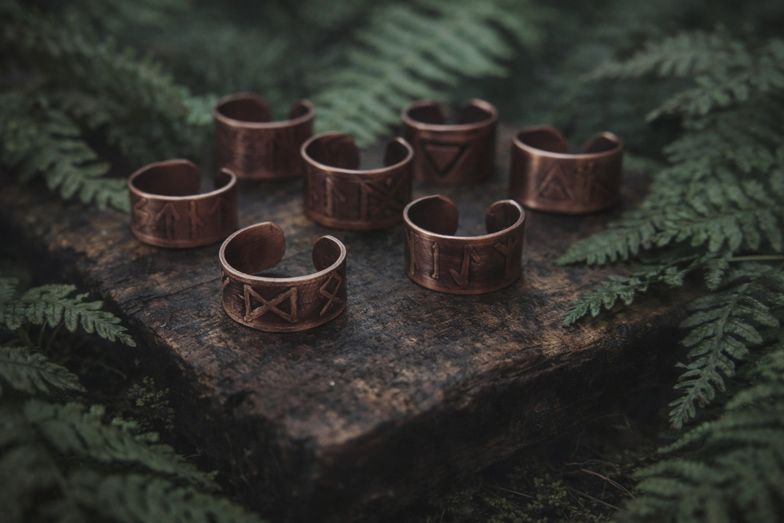 Ręcznie wykonana miedziana obrączka z runami dobieranymi indywidualnie wg intencji. Unikatowy symbol, który niesie znaczenie – dostępny w wersji węższej i szerszej