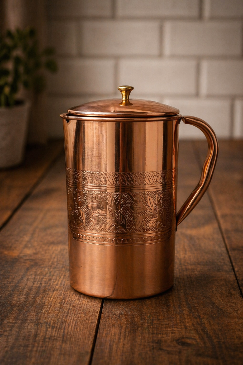 Miedziany dzbanek na wodę o pojemności 2l, wykonany ręcznie w Indiach z certyfikowanej miedzi. Idealny do codziennego rytuału picia wody i świadomej troski o ciało.