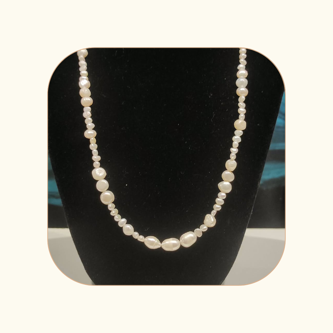 Elegancki naszyjnik z pereł słodkowodnych, o długości 50 cm z dodatkową 4 cm regulacji, pozwalający dopasować go idealnie do dekoltu. Perły o nieregularnych kształtach, od delikatnych 3 mm po pełne, okrągłe 8 mm, oraz w centralnym punkcie 10mm, tworzą naturalny, subtelny rytm i lekko połyskującą fakturę.