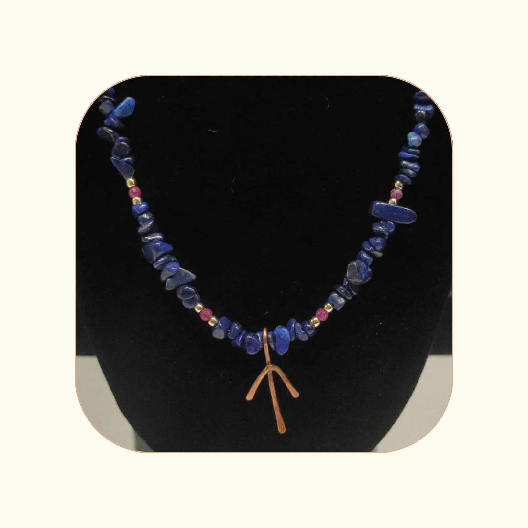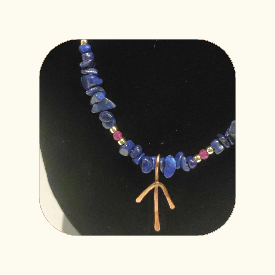Naszyjnik „Tiwaz – Cel w Samo Sedno” Lapis lazuli, hematyt i rubin tworzą energetyczny trio dla kobiet, które wiedzą, czego chcą. Lapis dodaje jasności umysłu, hematyt stawia Cię w pozycji „pewna siebie 2.0”, a rubin podkręca odwagę i ogień działania.