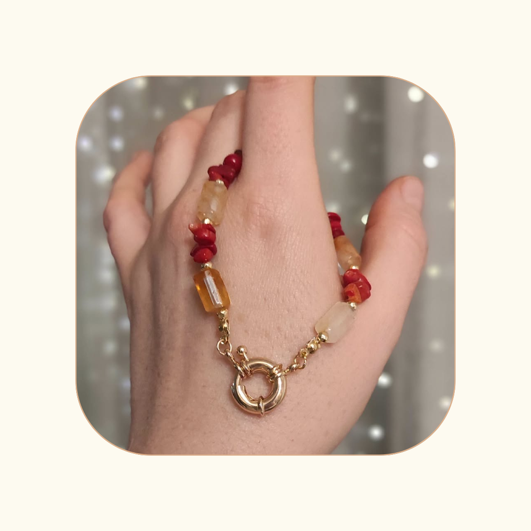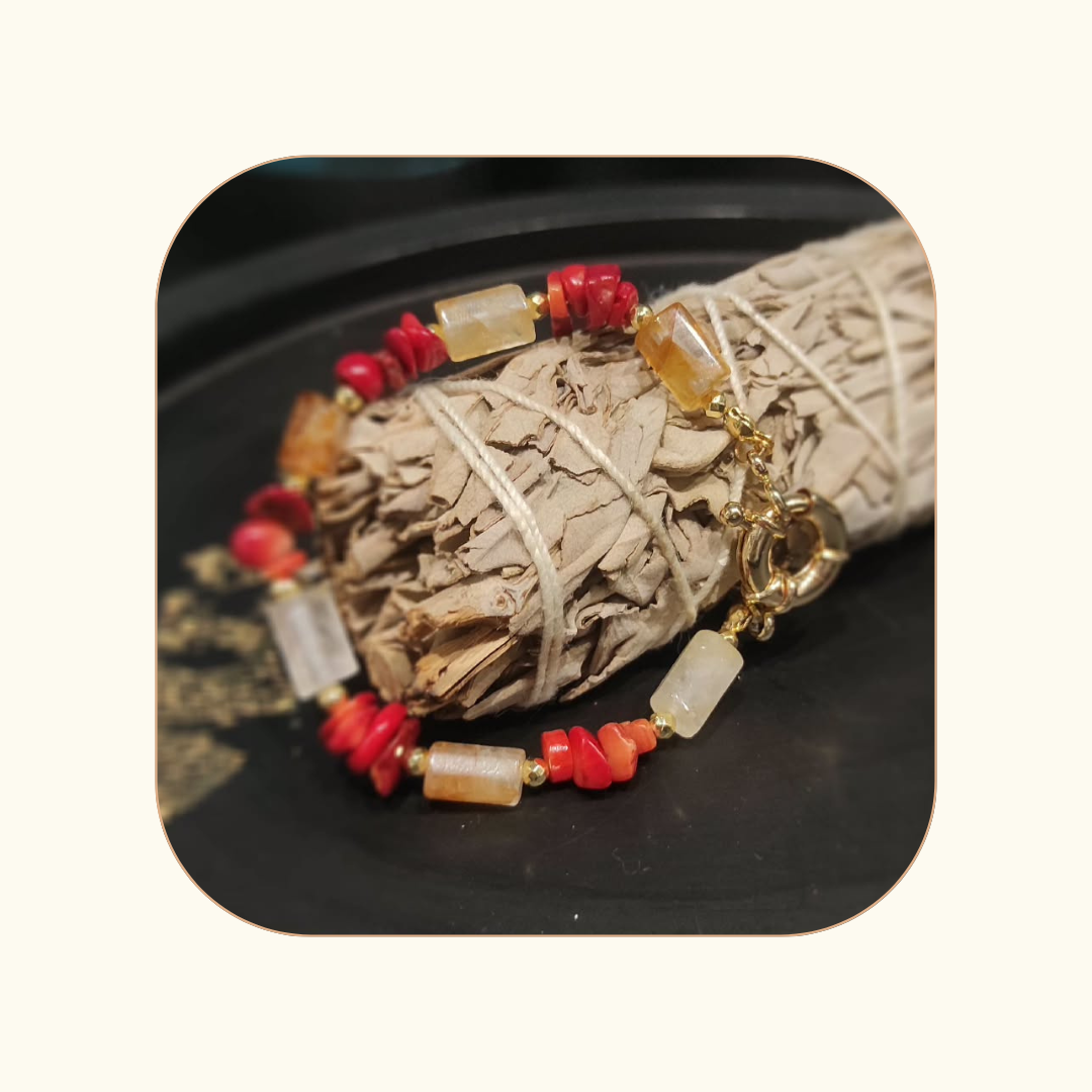 Połączenie życiowej energii i radości. Koral bambusowy wzmacnia witalność, odwagę i przepływ energii w ciele, a cytryn przyciąga obfitość, pewność siebie i jasność umysłu. Razem wspierają działanie, motywację i twórczą siłę – dodają lekkości, optymizmu i odwagi do sięgania po więcej.