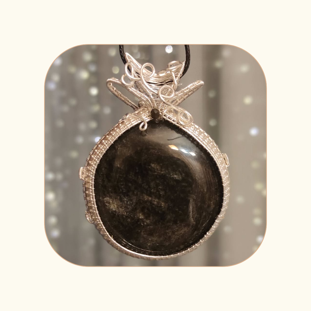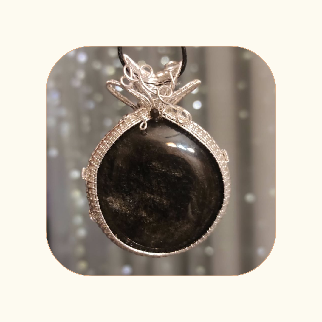 W sercu tego pięknego wisiorka znajduje się ogromne obsydian, który działa równie silnie ochronnie jak czarny turmalin. Opleciony został w posrebrzaną miedź, dzięki czemu nie utlenia się i nie odbarwia skóry.